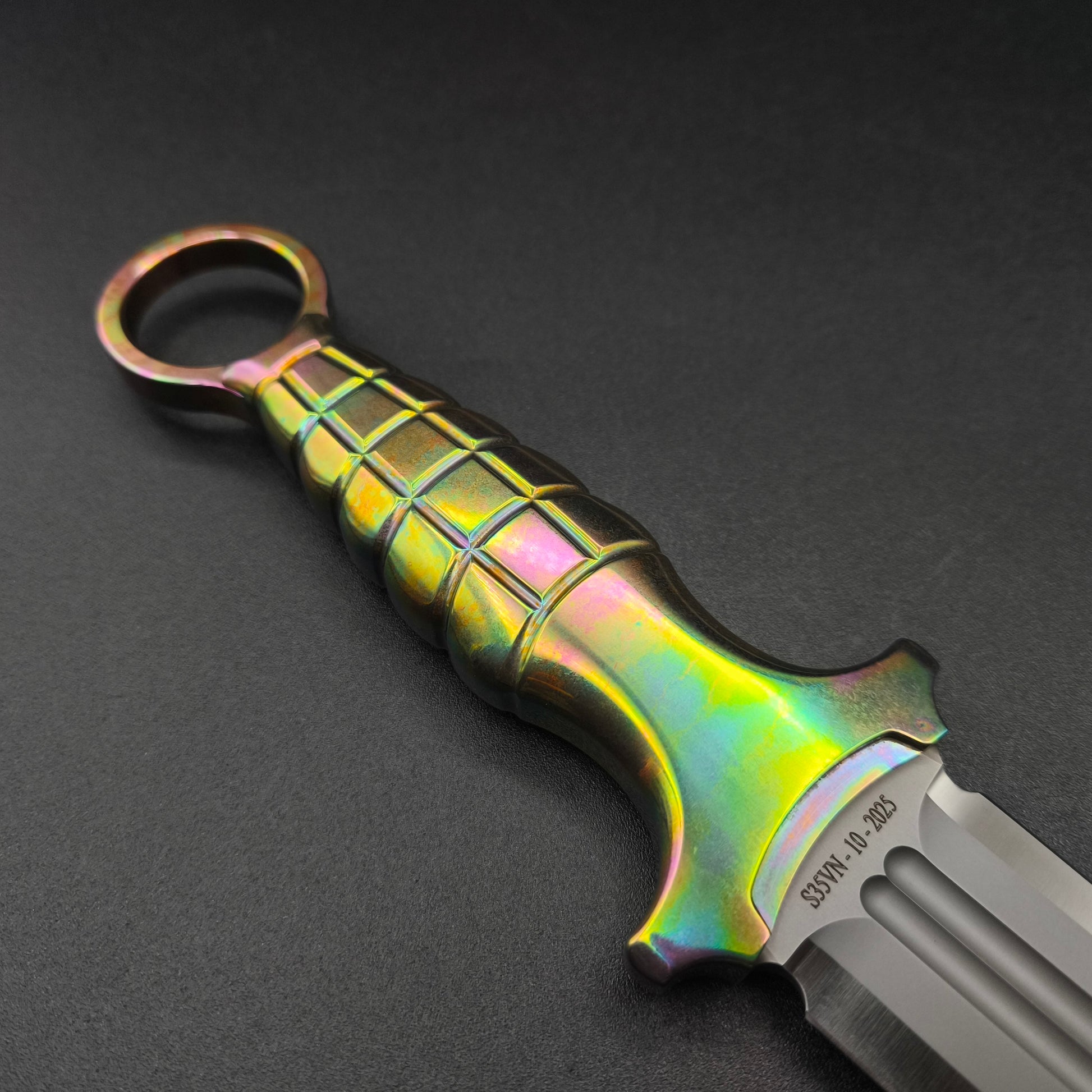 Here is a very special Dagger and definitely a real eye-catcher! Acid Rain Titanium, blade made of S35VN and with a carbon Kydex sheath.