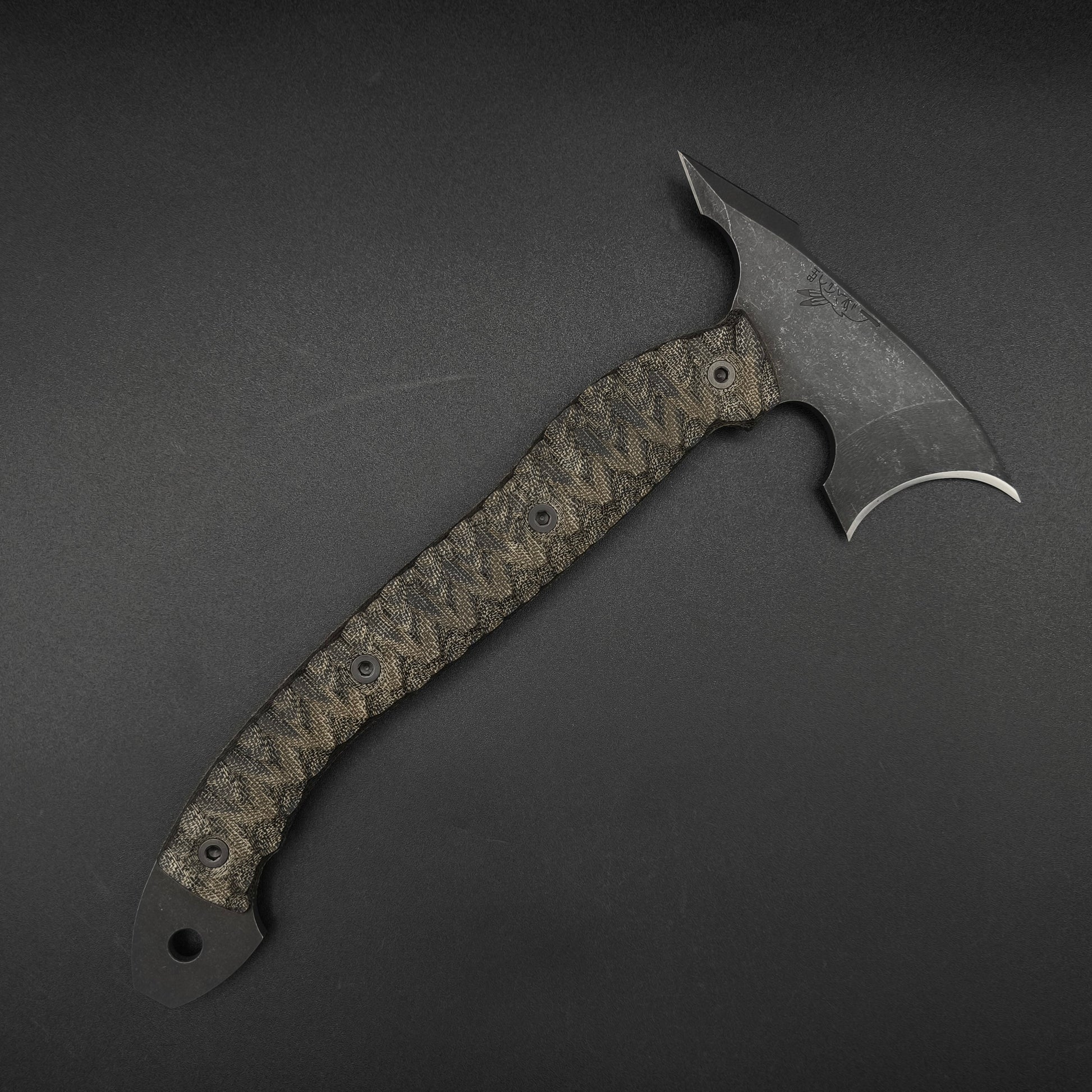 Crescent Hawk - Black and OD Green Canvas Micarta, Allen Bolts, textured Grip, Open Teng. With Kydex sheath and Belt Loops.