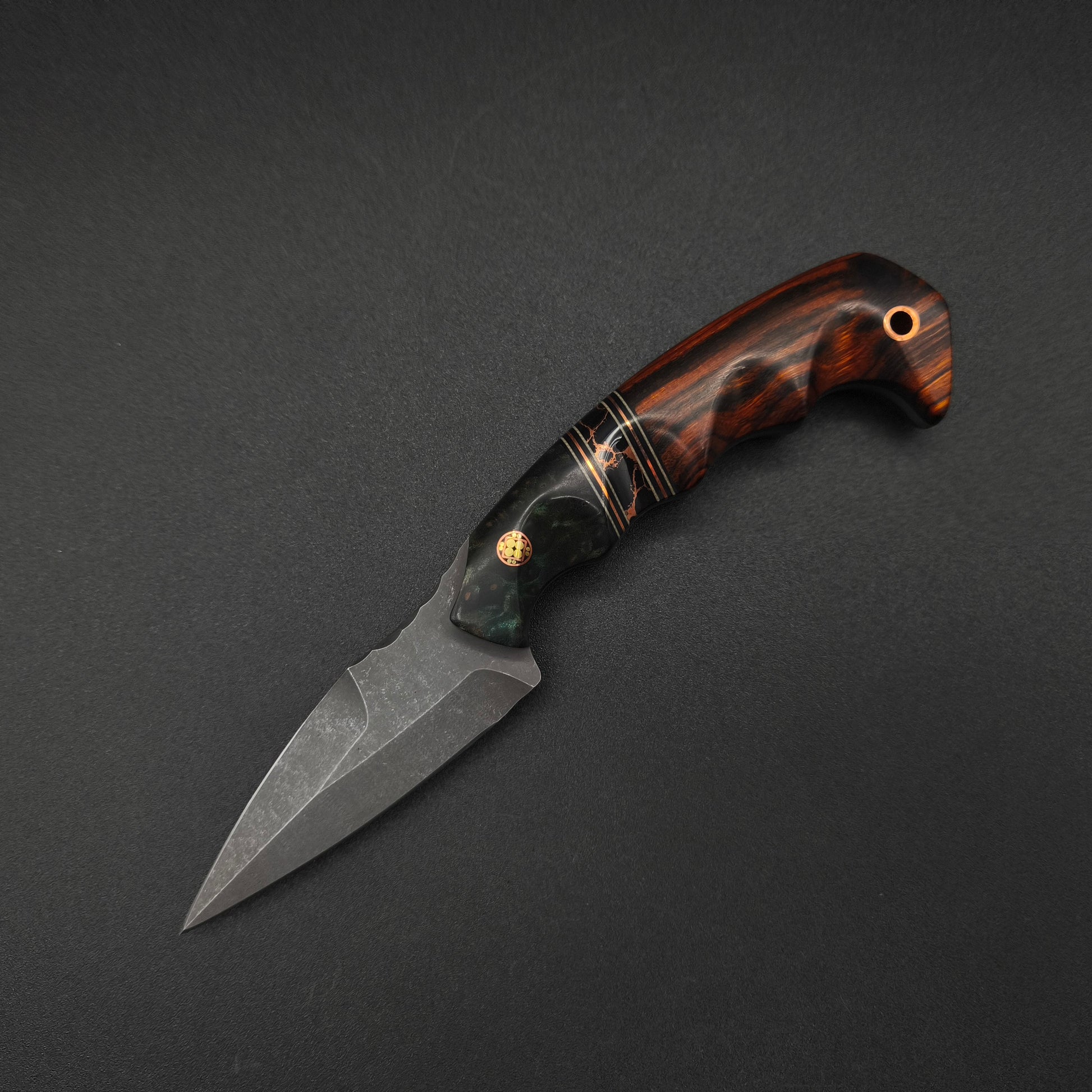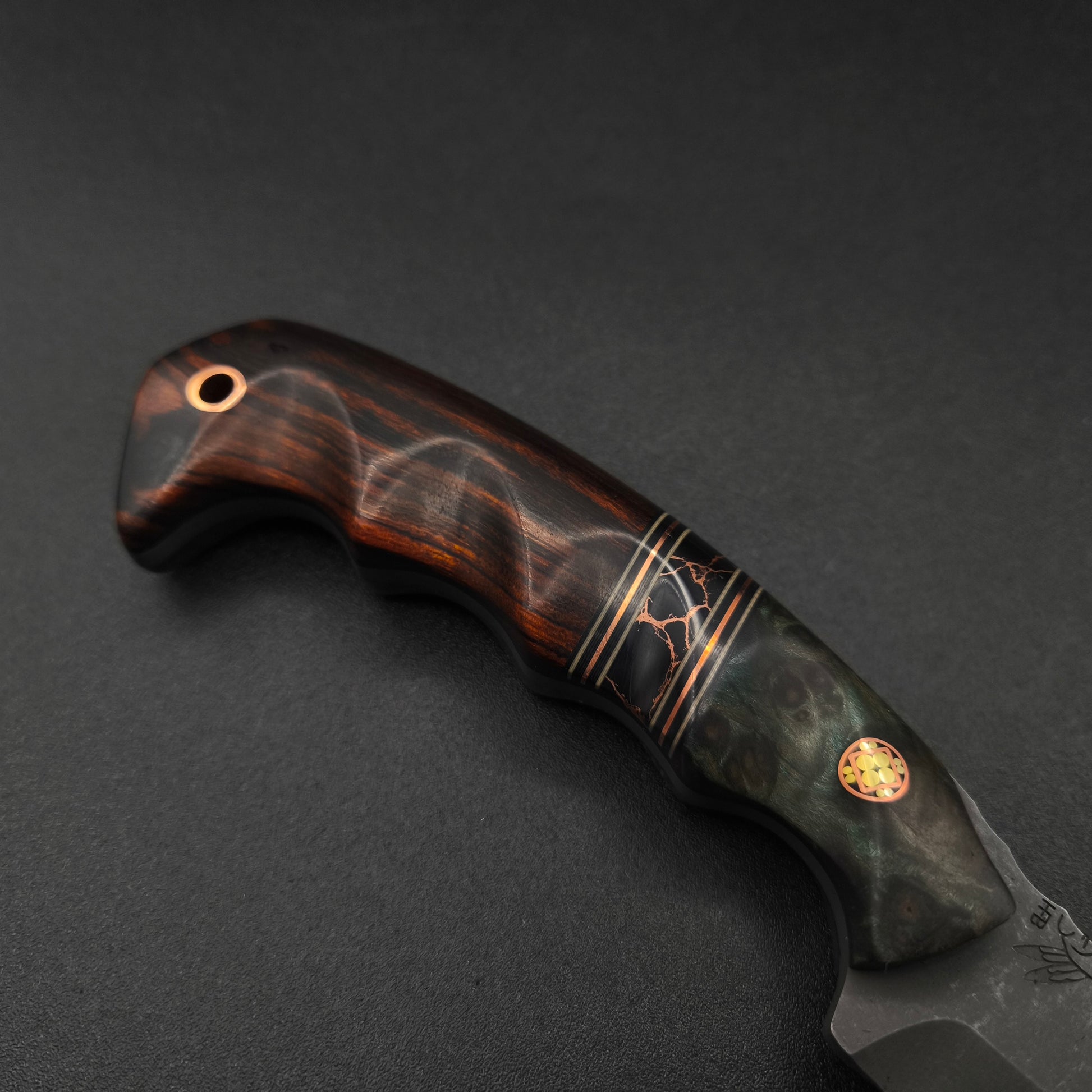 Half Face Blades 3" HUMINT- Dyed Redwood Burl, Black G10, Desert Tan G10 and Copper Pin Striping, Black with Copper Web Tru-stone Split, Desert Ironwood, Mosaic Pin, Copper Lanyard Pin, Grooved Grip. With Kydex sheath and Clip.