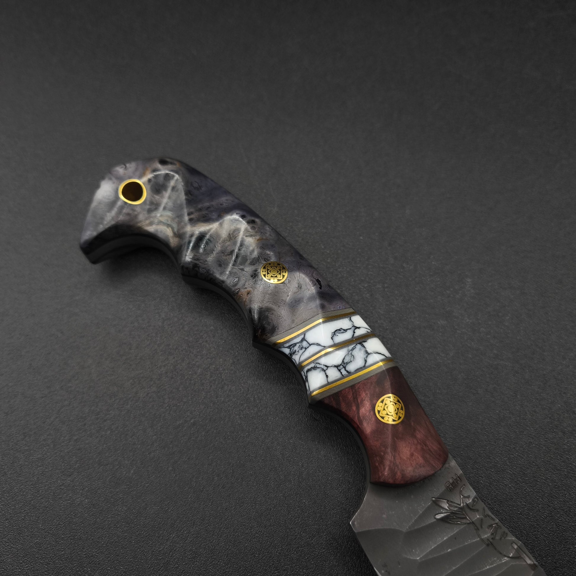 Handle material: Dyed Maple, Dyed Buckeye Burl