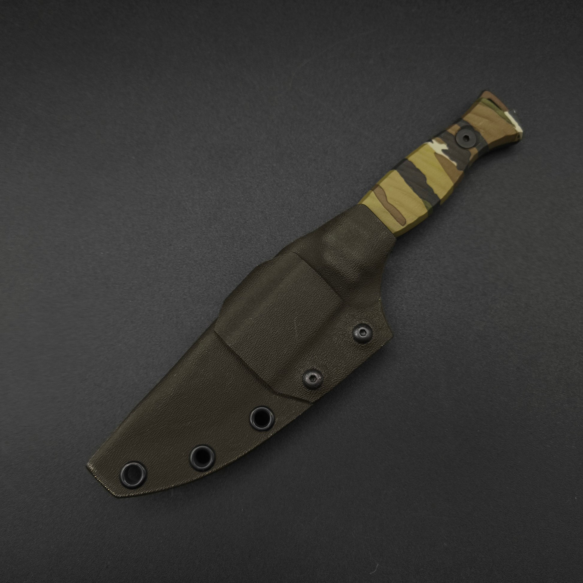 Half Face Blades The 86' (HFB x Realtree) - Realtree Original Camo Hydro-dipped Micarta, Midnight Bronze Cerakote, Allen Bolts, Textured Grip. With kydex sheath and clip.