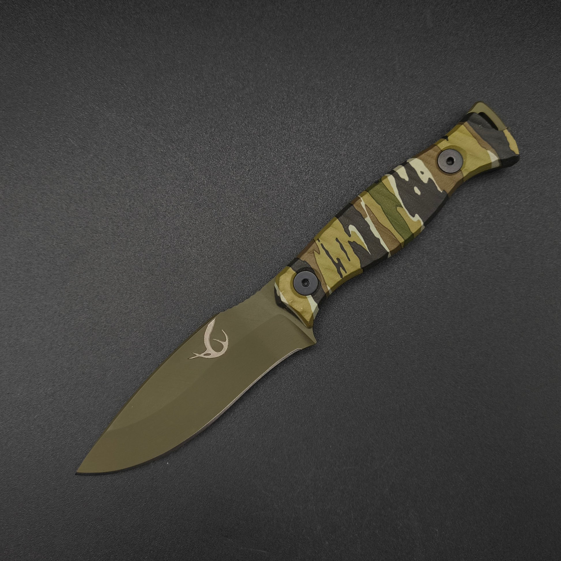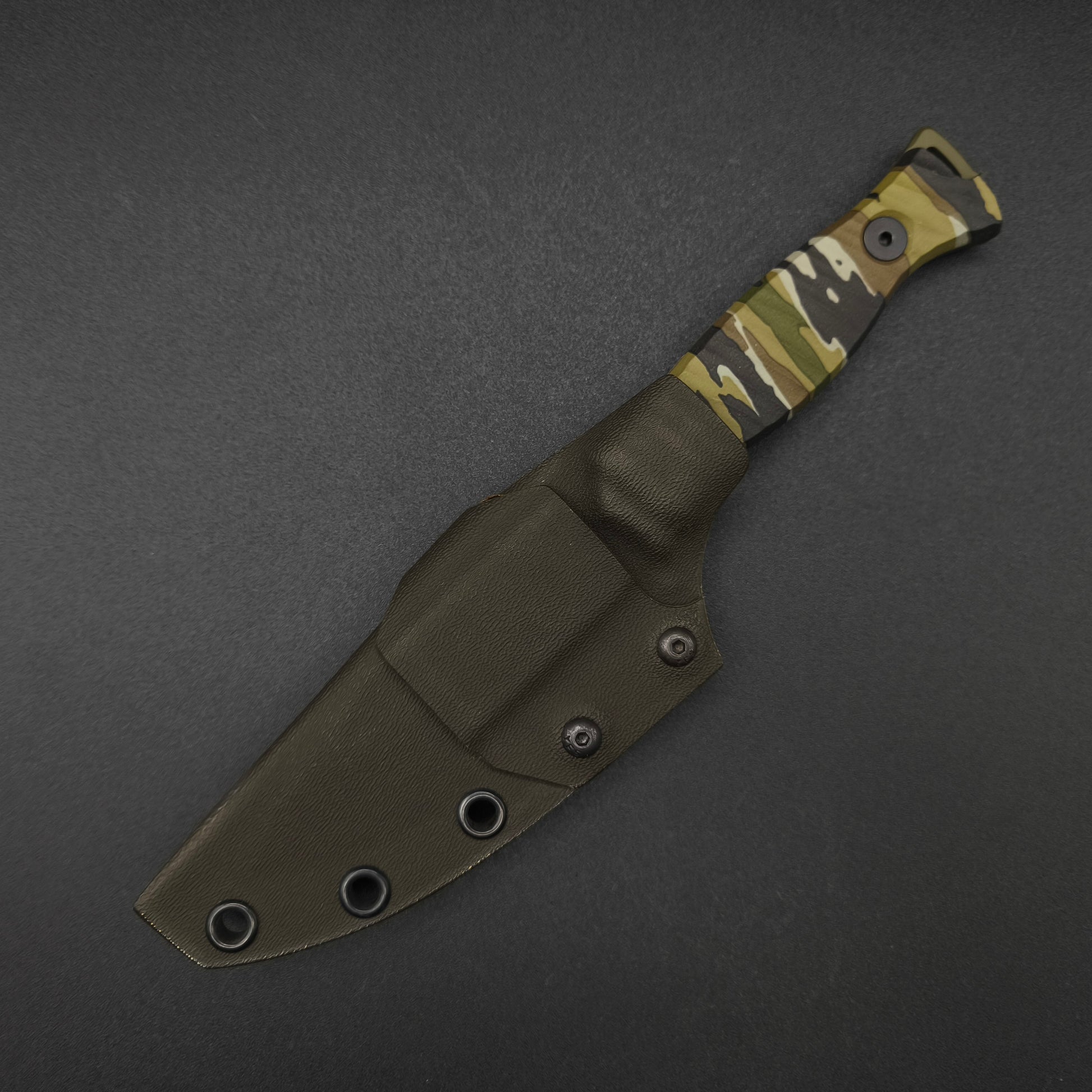 Half Face Blades The 86' (HFB x Realtree) - Realtree Original Camo Hydro-dipped Micarta, Sniper Green Cerakote, Allen Bolts, Textured Grip. With kydex sheath and clip.