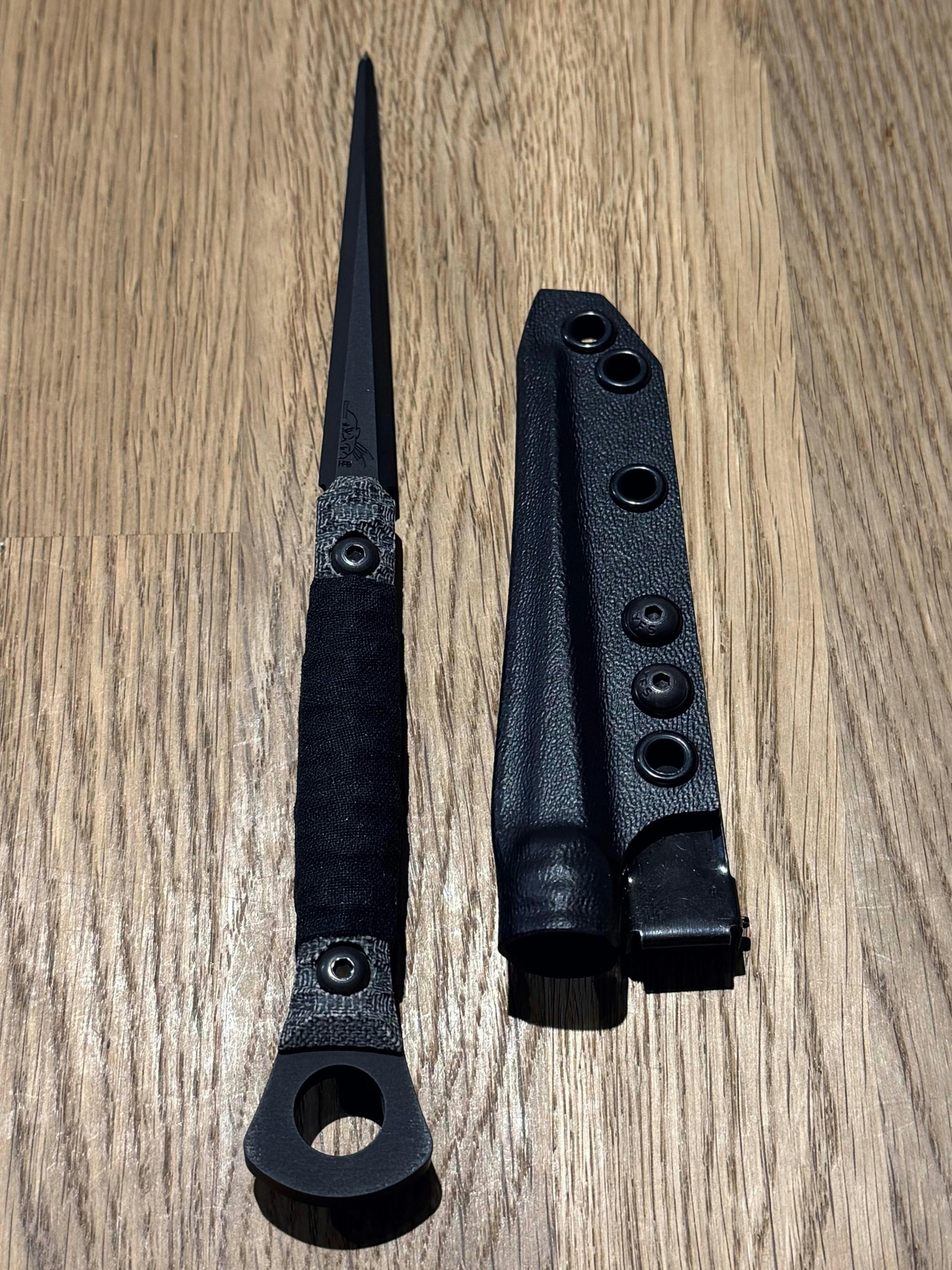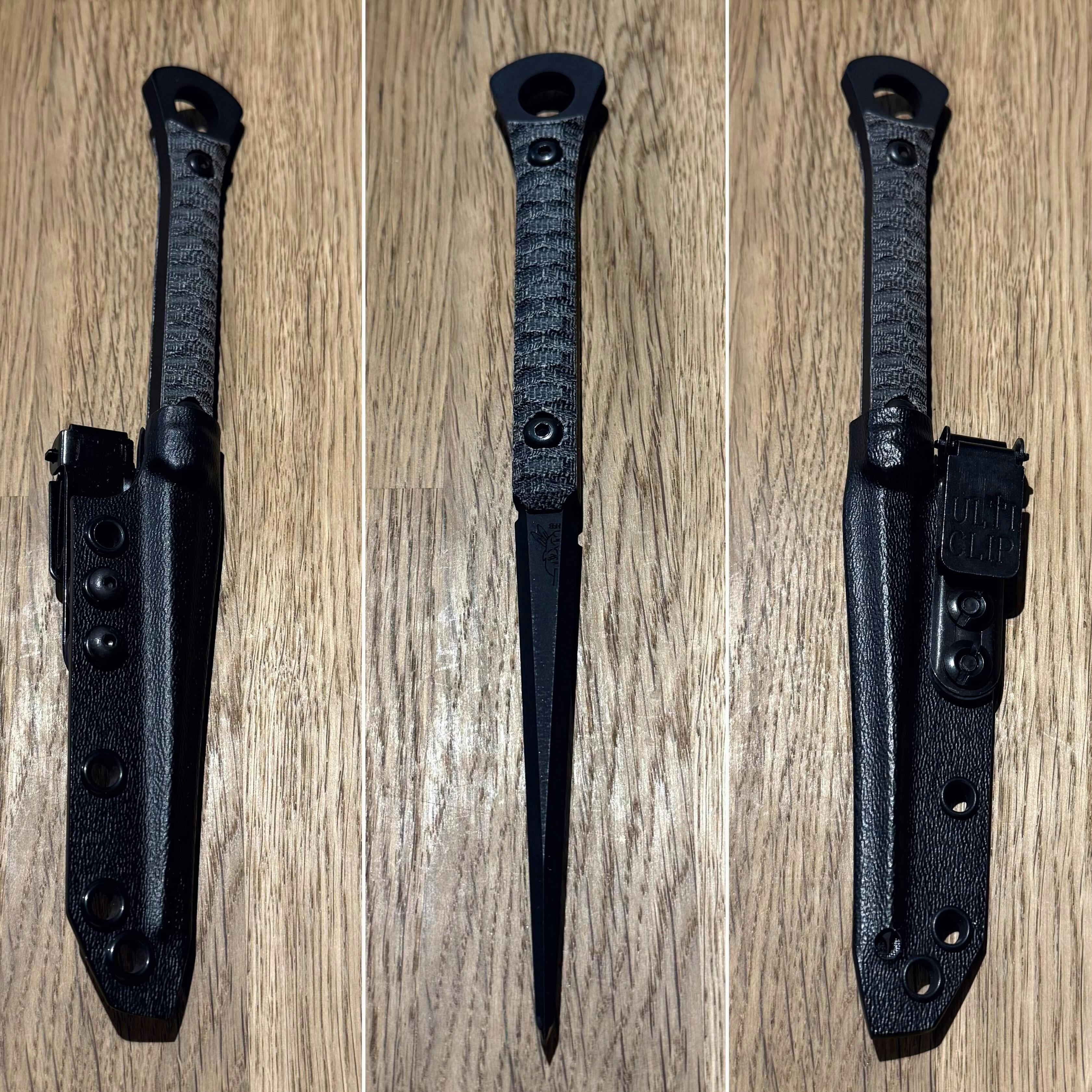 Cardiac Spike- Black Canvas Micarta, Armor Black Cerakote, Allen Bolts, Iron Grip. Mit Kydex Scheide und UltiClip.